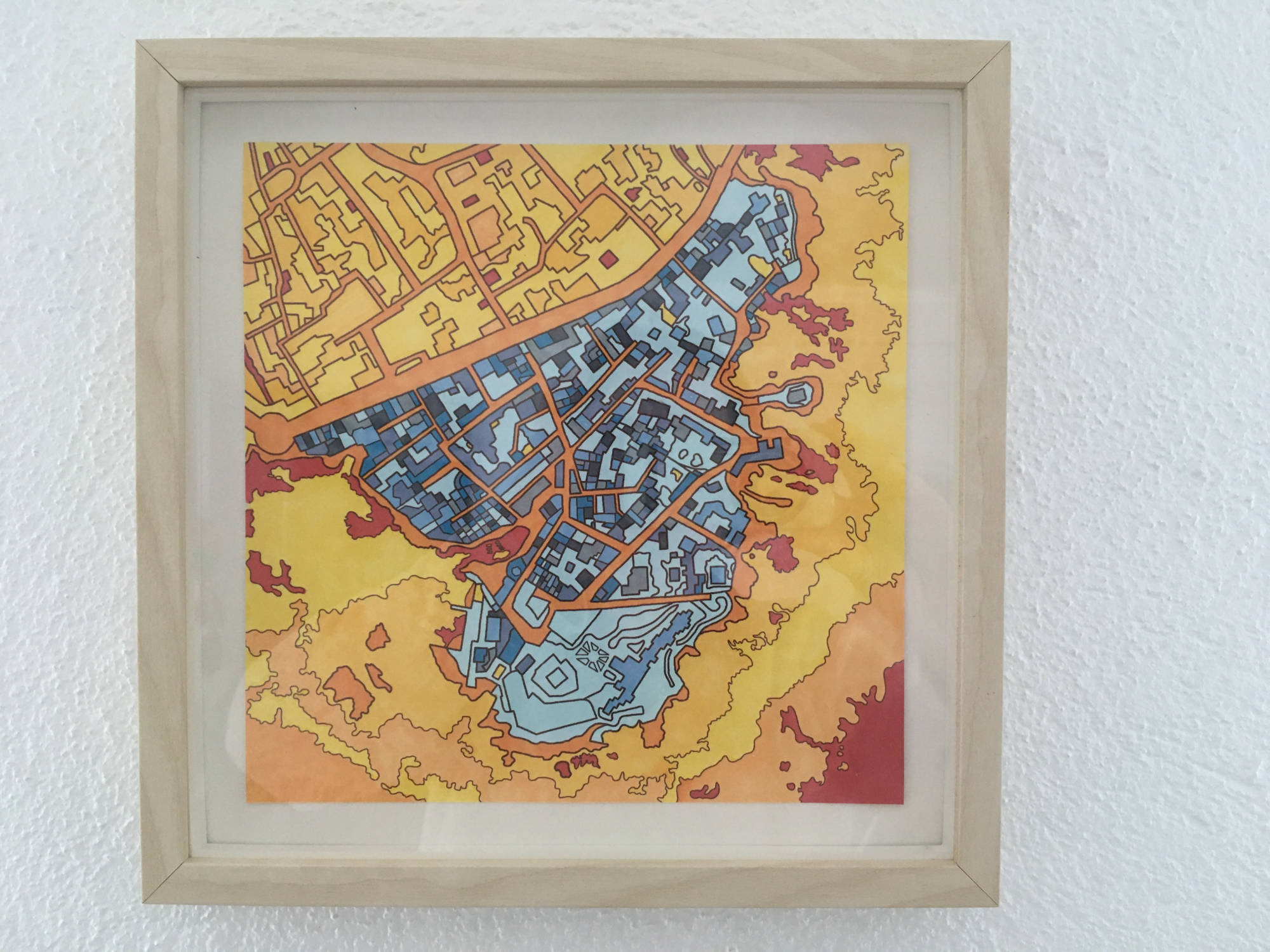 De la couleur pour sortir des codes et apporter poésie et rêve: terre et mer échangent leurs rôles. Urbanisme et courbes de niveau proposent d'autres interprétations..